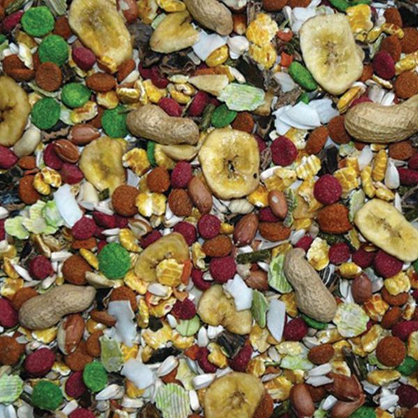 Sestavine: sadje (banana, jabolka, rozine, bezeg), ekstrudirana pšenica in koruza, pšenični kosmiči, rožič, arašidi, grahovi kosmiči, rumeno barvilo, sončnice, koruzni kosmiči, sirek, ječmen, alfalfa, oves, korenje, ajda