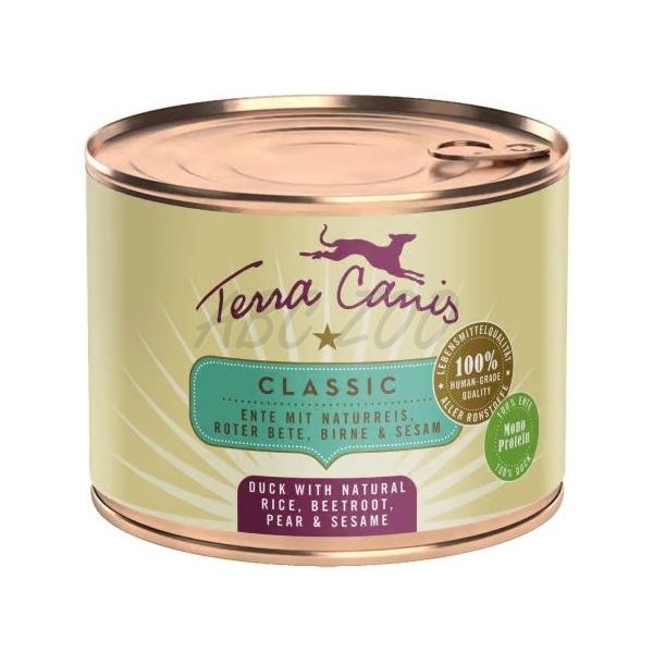 Terra Canis konzervirana hrana iz linije CLASSIC vsebuje velik delež mesa ter sveže zelenjave, sadja in zelišč. S hranili bogata, lahka, brezglutenska psevdožita (npr. proso, amarant, naravni riž) so dodana v zelo majhnih količinah, ki so za psa lahko prebavljive (4-10 %). Naravne sestavine (morske alge, mineralna glina, cvetni prah, šipek, andska sol, pivski kvas) zagotavljajo pomembne vitamine, minerale in elemente v sledovih. Olje oljne ogrščice zagotavlja dragocene esencialne maščobne kisline. Vse sestavine so 100-odstotno v skladu s kakovostjo za ljudi.