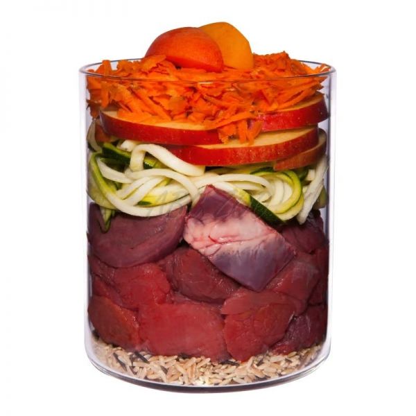 Sestava: Goveja srčna mišica (30 %), bučke, korenček (12 %), goveja pljuča (11 %), jabolko (9 %), goveja jetra (7 %), naravni riž (6 %), goveja mišica (4,5 %), marelice, repično olje, ostrige*, pivski kvas*, bazilika*, koromačevo seme, peteršilj*, šipek v prahu*, mineralna glina* morske alge*, minerali