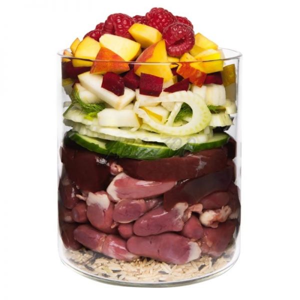 Sestava: Račje srce (42 %), račja jetra (11 %), hruška (7 %), breskev, koromač, kumara, naravni riž (7 %), rdeča pesa* (7 %), maline (1,5 %), repično olje, ostrige*, mleti sezam* (0,4 %), pivski kvas*, kumina*, mineralna kumina*, muškatna sol*, majaron* morske alge*, mineralna