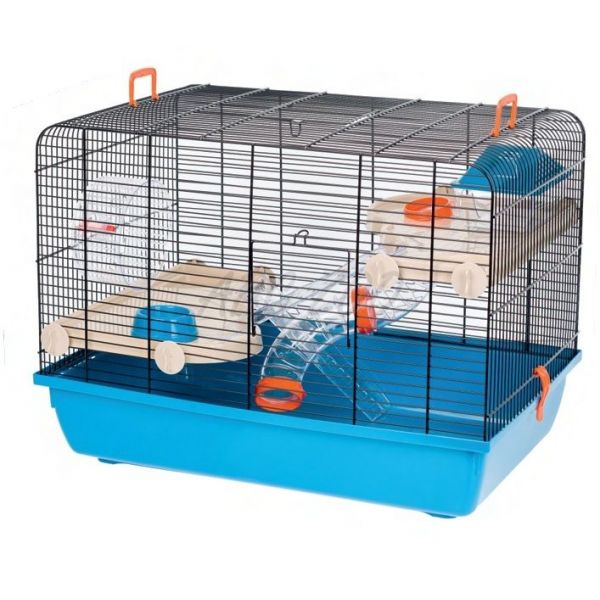 Opremljena kletka za hrčka ali miško. Modra barva posode. Več podrobnosti