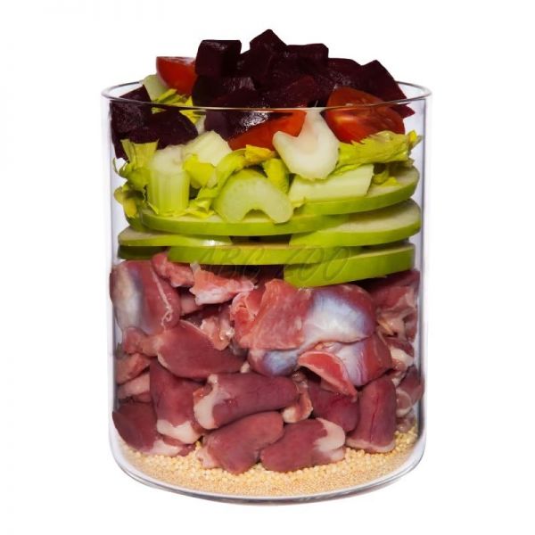 Sestava: Piščančje srce (24 %), paradižnik (17 %), piščančji želodec (16 %), piščančja jetra (11 %), hruška, amarant (5 %), piščančja mišica (4 %), proso, rdeča pesa*, steblo zelene, kokosova moka, repično olje, ostrige*, pivski kvas*, bazilika* (0,4 %), mineralna glina*, andska sol, šipek*, morske alge*, minerali