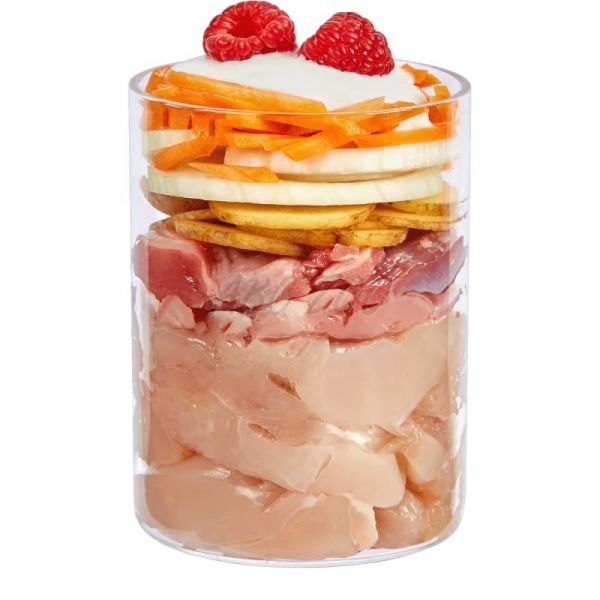 Sestava: Piščančje srce (33 %), piščančji želodec (20 %), korenček, krompir (9 %), piščančja mišica (7 %), koromač, hruška, malina (4 %), kokosova moka (2 %), repično olje, kozje mleko (1 %), probiotiki (Emiko® EM Mix) (0 %), kokosova moka (2 %), kozje mleko (1 %),5 %), ostrige*, mineralna glina* (0,4 %), semena črne kumine, lupina indijskega trpotca (0,3 %), kamilica* (0,2 %), kumina* (0,2 %), janež* (0,2 %), lubje bezga* (0,2 %), morske alge*, minerali