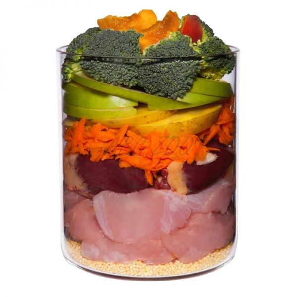 Sestava: puranje srce (40 %), korenje, krompir (11 %), puranja jetra (11 %), hruška (7 %), proso, puranje meso (4 %), marelice, brokoli (1,5 %), repično olje, ostrige*, pivski kvas*, mleto laneno seme*, bazilika*, peteršilj*, mineralna glina*, cvetni prah*, morske alge*, minerali