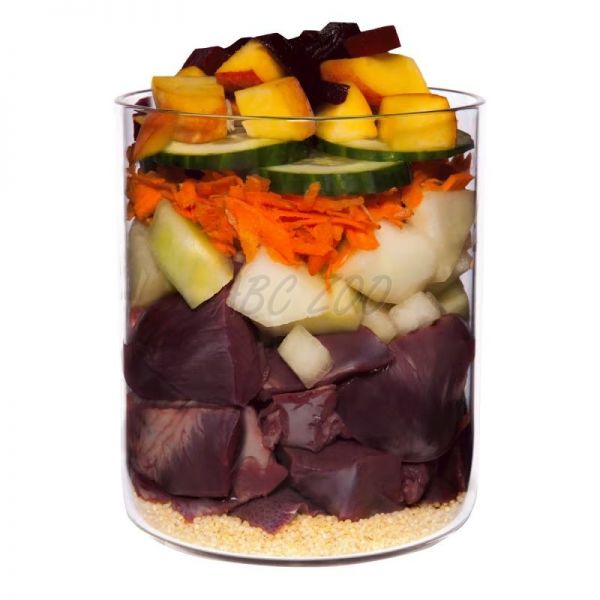 Sestava: Meso telečje srčne mišice (41 %), telečja pljuča (15 %), korenje, proso (8 %), rumena melona (6 %), zelena, kumare (5 %), rdeča pesa* (4 %), marelice (3 %), repično olje, ostrige*, pivski kvas*, bazilika*, vodna kreša*, rakitovec*, andska sol, seme koromača*, mineralna glina*, šipek*, morske alge*, minerali