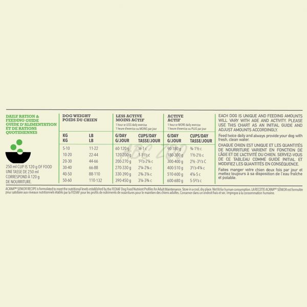 Hrana Acana Dog Senior je pripravljena iz najboljših in najbolj svežih sestavin. Odlikuje jo visoka vsebnost beljakovin in majhen delež saharidov.