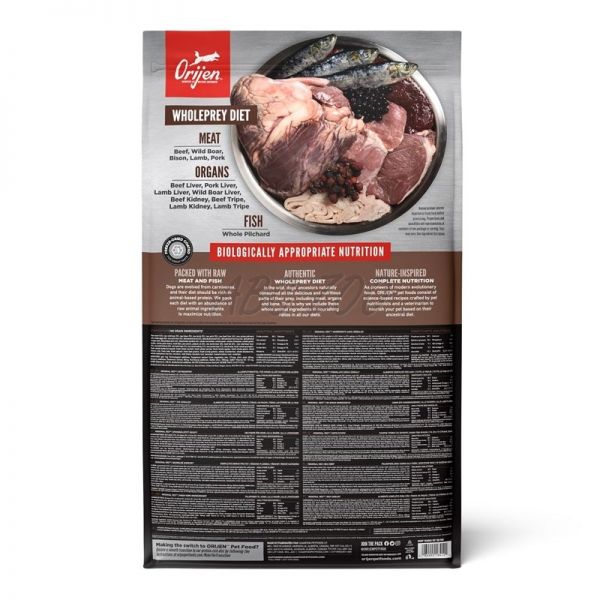 Psi kot mesojedci so navajeni na hrano, ki je bogata s svežim mesom in vsebuje manj sadja, jagodičevja in trave. Hrana Orijen vašemu psu nudi vse prednosti surove hrane, ki jo lahko najde v divjini. Hrana je nežno zmrznjena, da ohrani naraven okus svežih lokalnih sestavin.