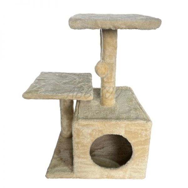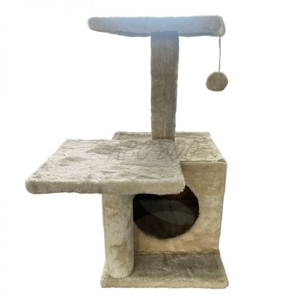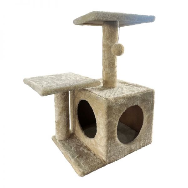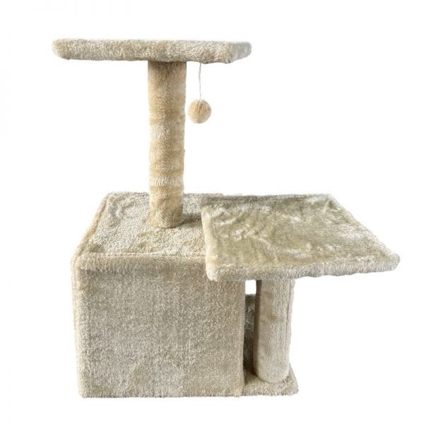 Ta večnivojski mačji praskalnik je idealen za aktivne mačke, ki obožujejo plezanje in opazovanje svojega okolja z višine. Ima dve počivališči, od katerih je eno višje – idealno za opazovanje dogajanja doma. V spodnjem delu se nahaja zaprta hišica, ki nudi prijetno mesto za počitek. Mehka plišasta oblika in viseča igračka dodatno spodbujata radovednost in aktivnost mačke.