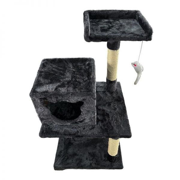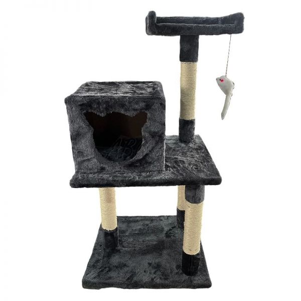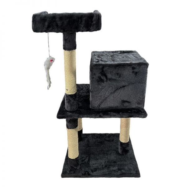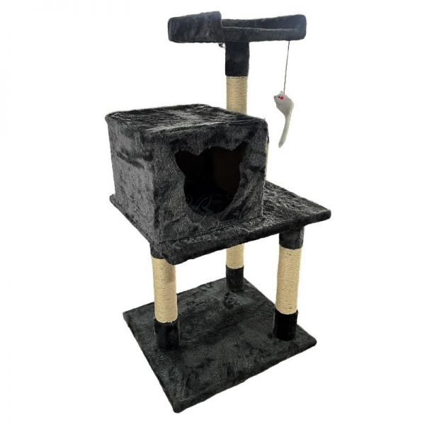 Ta stabilen in kompakten praskalnik ponuja vse, kar vaša mačka potrebuje za vsakodnevno zabavo in počitek. Na dnu se nahaja prijetna škatla za spanje z ljubkim vhodom v obliki mačje glave, medtem ko zgornja opazovalna ploščad omogoča udoben počitek z razgledom. Ne manjka niti igriva plišasta miška, obešena na vrvici, ki spodbuja instinktivno igro in aktivnost vaše mačke.
