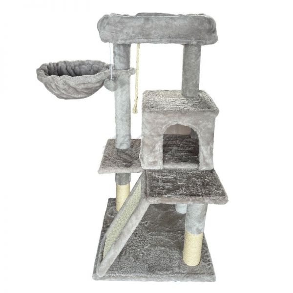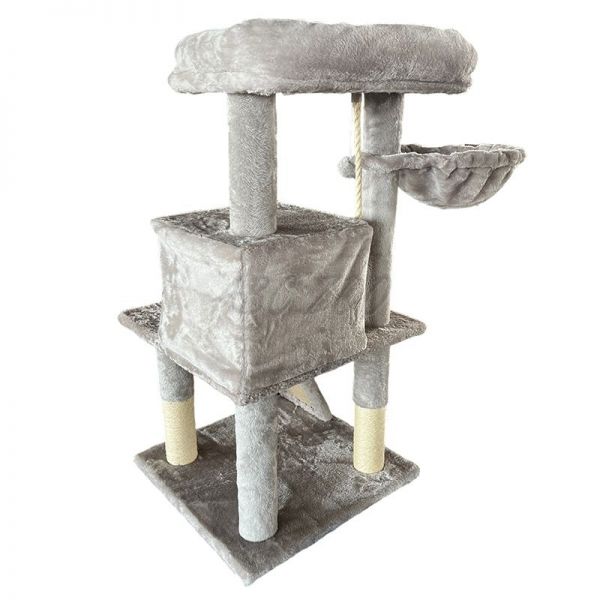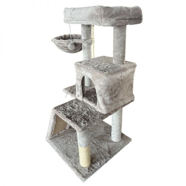 Ta praskalnik ponuja prostorno ležišče, prijetno hišico za skrivanje, mehak viseči ležalnik in igralno žogo, zato je idealno mesto za igro in sprostitev. Stebrički, oviti s sisalom, pomagajo mački naravno obrusiti kremplje brez poškodovanja pohištva. Zaradi nagnjene praskalne površine in več nivojev je primeren tudi za starejše ali manj gibčne mačke.