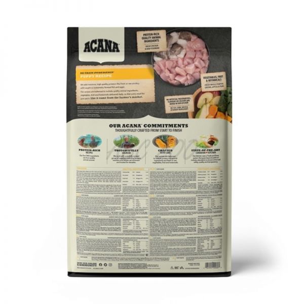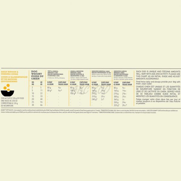 Vsi pasji mladiči so po naravi mesojede živali in so zato biološko prilagojeni na prehrano z različnimi vrstami mesa in manjšo vsebnostjo sadja, zelenjave in zelišč. Hrana Acana Dog Puppy & Junior je bogata s hranilnimi beljakovinami iz mesa in maščobami ter vsebuje manjši delež saharidov in nič visoko glikemičnih žitaric.