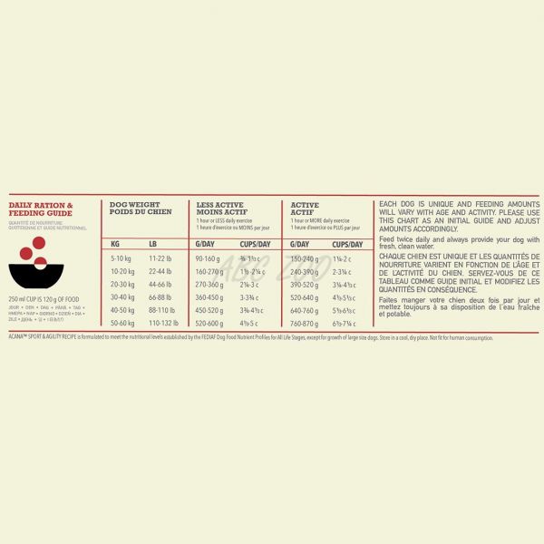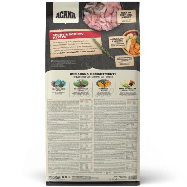 Sestavine: svež piščanec (20 %), piščančja moka (20 %), cela rdeča leča, cel stročji fižol, piščančja maščoba (8 %), puranja moka (7 %), sveža piščančja drobovina (jetra, srce) (4 %), moka iz sleda (4 %), jajca (4 %), surova iverka (4 %), ribje olje (3,5 %), cela čičerika, cela zelena leča, cel rumeni grah, grahov škrob, surova puranja jetra (0,5 %), sol, suh kelp, sveža maslena buča, sveže celo korenje, sveža cela jabolka, sveže cele hruške, sveže cele bučke, suha korenina cikorije, svež ohrovt, sveža špinača, sveži listi repe, sveži listi pese, sveže cele brusnice, sveže cele borovnice, sveže cele šmarne hrušice, kurkuma, pegasti badelj, korenina repinca, sivka, korenina navadnega sleza, šipekAnaliza sestave: surove beljakovine 35 %, maščoba 22 %, surove vlaknine 5 %, surov pepel 8 %, kalcij 1,7 %, fosfor 1,1 %, Omega 6: 2,7 % Omega 3: 1,2 %, DHA 0,4 %, EPA 0,4 %, glukozamin 800 mg/kg