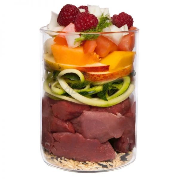 Razmerje Meso : riž naravni : zelenjava/sadeži/zelišča : druge sestavine = 60 % : 7 % : 31 % : 2 %