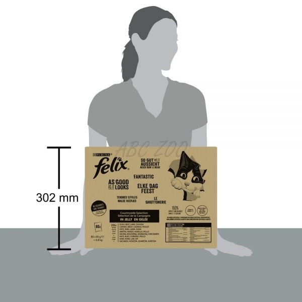 FELIX Fantastic je linija odličnih hran, ki izgledajo, dišijo in so tako slastne, kot če bi jih sami pripravili! Vsaka hrana, narejena iz kakovostnih sestavin, vsebuje sočne koščke v želeju, da se vaša mačka lahko pošteno zagrize v okusne koščke! Hkrati je vir omega-6 maščobnih kislin in ima pravo kombinacijo vitaminov, ki pomagajo vaši mački ohraniti energijo ter pripravljenost na pustolovščine! Polna dobrot, ki zadovoljijo 100 % dnevnih potreb vaše mačke, ko uporabljate v skladu z navodili za hranjenje. To ni vse! FELIX Fantastic je na voljo v številnih okusnih recepturah v sočnem želeju, da vsak dan zadovolji ljubezen vaše mačke do raznolikosti. Resnično so tako dobre, kot izgledajo! FELIX je preprosto neustavljiv!