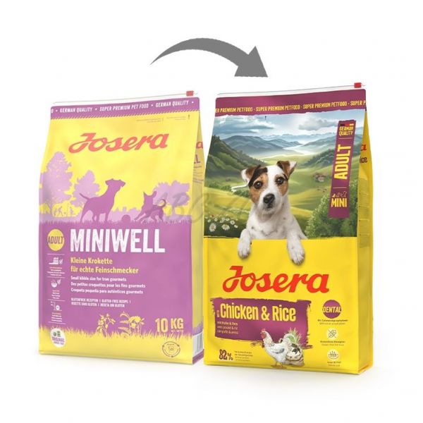 Josera Mini Chicken & Rice je prilagojena posebnim potrebam majhnih psov – s primerno majhno velikostjo briketov. Brezglutenska receptura s piščančjim mesom in rižem je dobro prebavljiva in okusna – idealna za pse z občutljivim prebavnim traktom. Sestavine, kot so dragocene maščobne kisline, vitamini, cink in baker, zagotavljajo sijočo dlako in lepo kožo. Miniwell se zdaj imenuje Mini Chicken & Rice. V novi embalaži, a z enako preizkušeno recepturo.