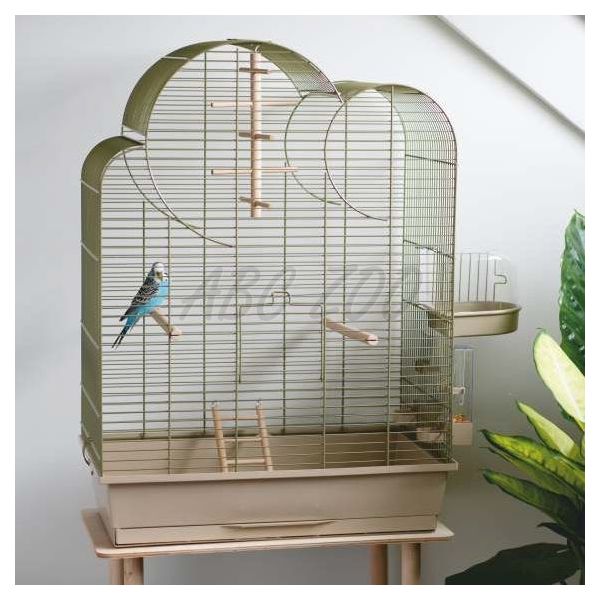 Elegantna kletka za papige z vso opremo. Zelena mrežica, bežna posodica. Več podrobnosti