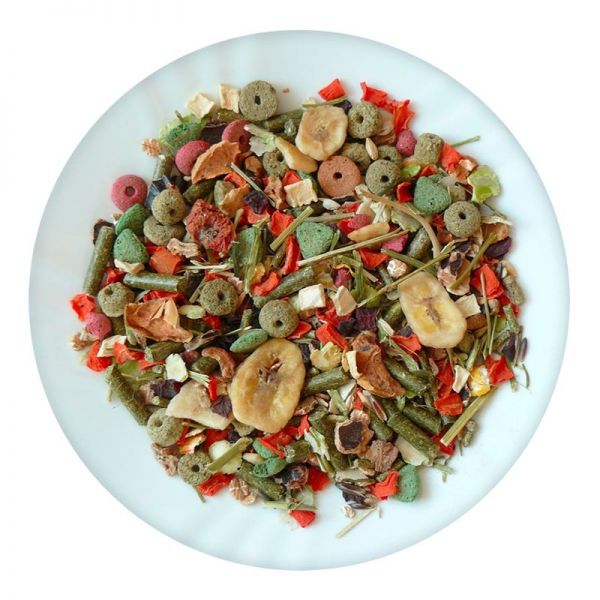Sestavine: lucerna, zelenjava (korenje, rdeča pesa, pastinak, peteršilj), ekstrudirana pšenica, ekstrudirana koruza, grahovi kosmiči, sadje (jabolka, banane), rožiči, oves, pšenični kosmiči
