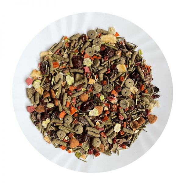 Selektivna in uravnotežena krmna mešanica za činčile, primerna za dolgotrajno hranjenje, z dodatnim deležem zelenjave in sadja, brez polnovrednih žitnih zrn. Brez dodanih konzervansov, sladkorja in umetnih arom.