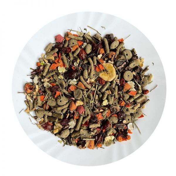Selektivna in uravnotežena krmna mešanica za morske prašičke, primerna za dolgotrajno hranjenje, bogata s celo zelenjavo, sadjem, čipsom in deteljinimi obročki.