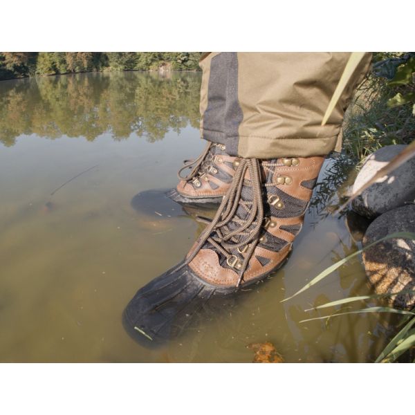 Kakovostno vezanje s kovinskimi zankami in kljukicami trdno fiksira nogo, visok kroj pa ščiti pri globokem snegu. Zgornji rob olajša obuvanje. Rjavo-črni dizajn se prilega ribiški, lovski in outdoor opremi.