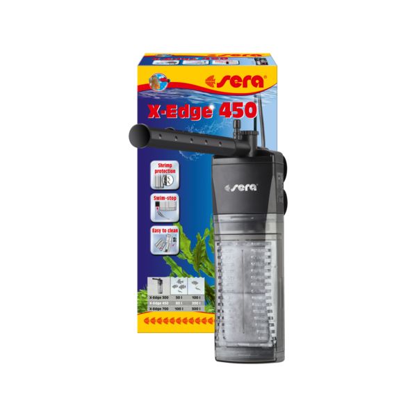 Vsebina paketa: Kotni filter sera X-Edge 450, filc, filtračna pena, biološki filtražni medij sera siporax mini Professional, razpršilna rampa, iztok »racji kljun«, Air-Set, nosilec s sesalnimi kozarci.