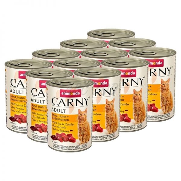 Konzerva mačje hrane CARNY ADULT z govedino in piščančjimi ter račjimi srci - 12 x 400g