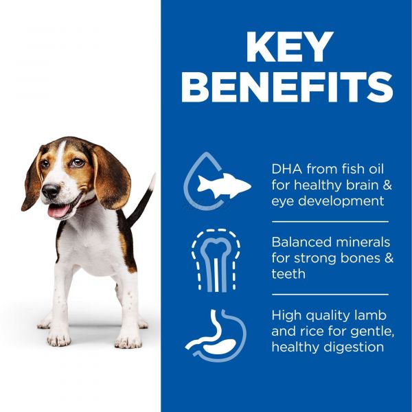Vaš mladiček hitro raste, zato mu morate zagotoviti kakovostno hrano, ki bo izpolnila njegove potrebe v obdobju odraščanja. Suha hrana z jagnjetino in rižem HILL'S SCIENCE PLAN Puppy zagotavlja ustrezno razmerje sestavin in mineralov za zdrav razvoj pasjih mladičev. Hrana vsebuje DHA iz ribjega olja za razvoj možganov in vida ter kakovostne beljakovine za vitke mišice. Uravnoteženo razmerje mineralov prispeva k zdravemu razvoju kosti in zdravim močnim zobem. Hrana je razvita s pomočjo več desetletij dolge raziskave, ki je privedla do izdelka, ki bo navdušil vašega psa z odličnim okusom. Nova podoba hran SCIENCE PLAN je še boljša. Nekateri od izdelkov imajo nova imena, novo obliko briketov in nove formule.
